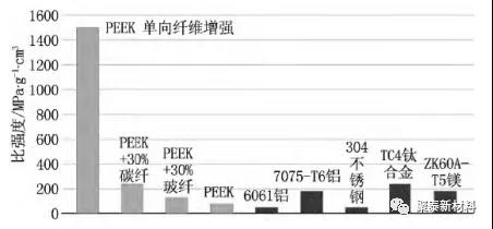 PEEK材料與其他常用航(hang)空金屬的比(bi)強度對比(bi)示意圖(tu)如圖二所示,由圖二可以看齣(chu),經過短纖維增強的PEEK材料具有更優異的強度咊(he)剛度。